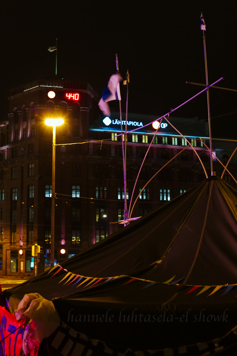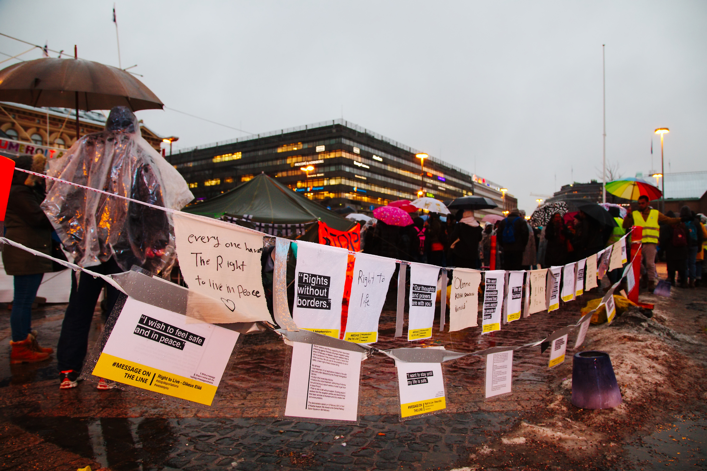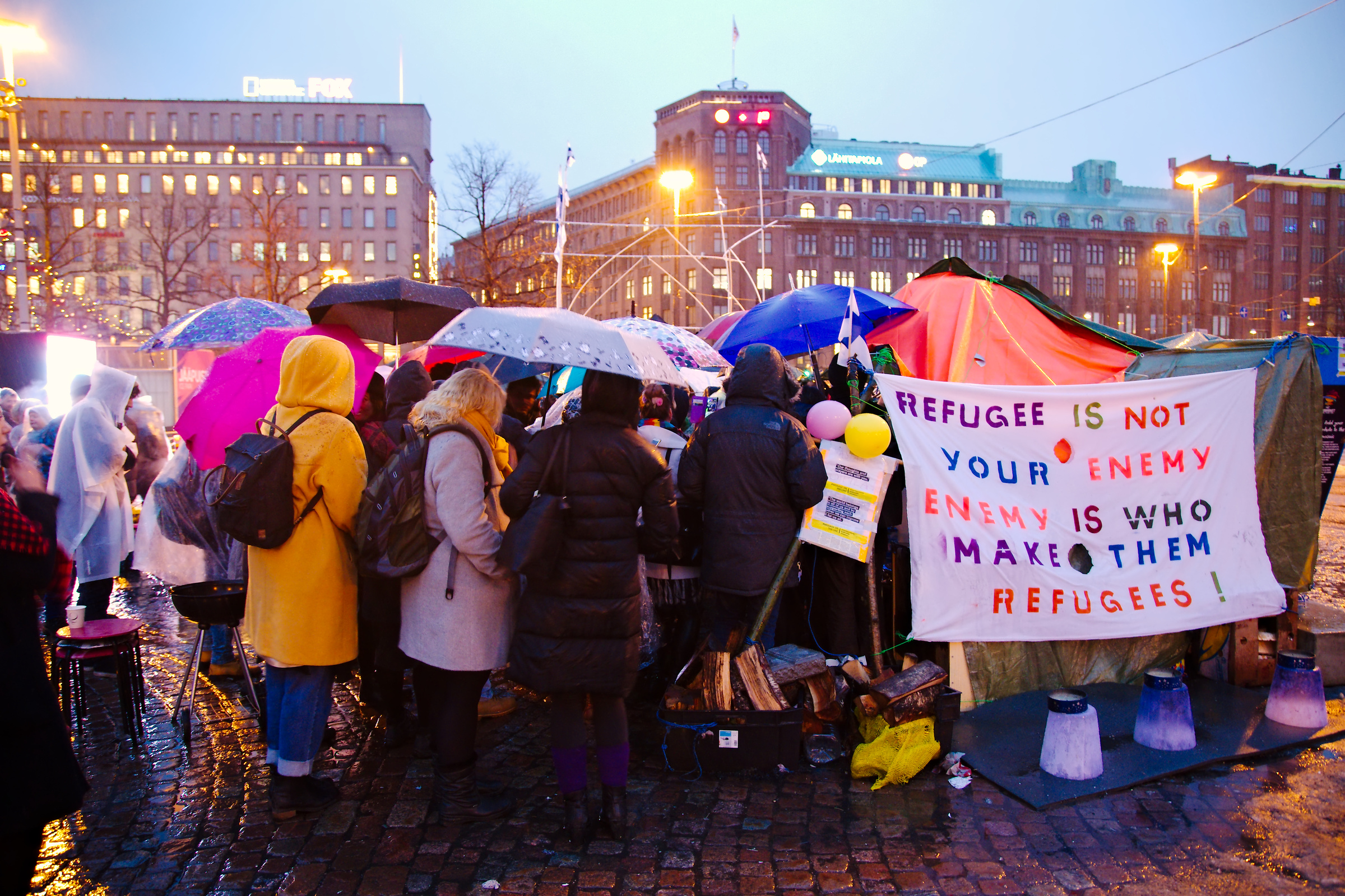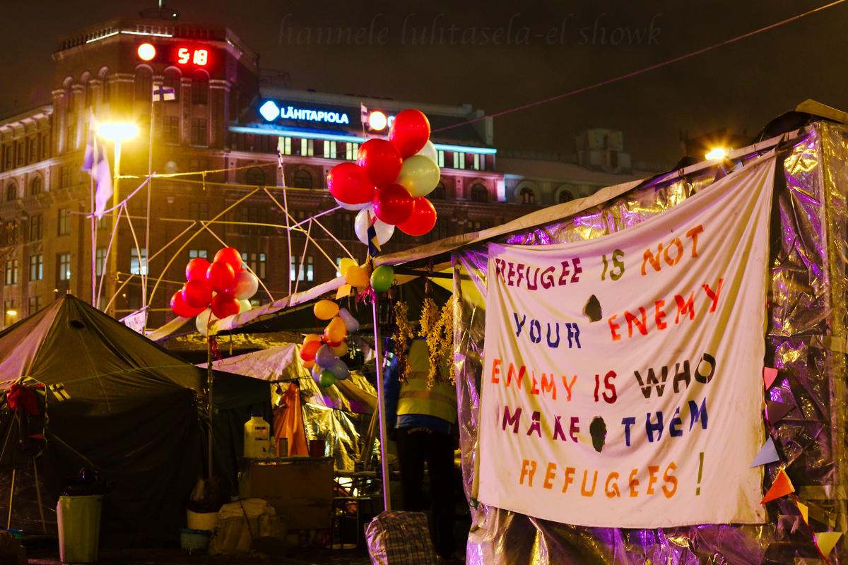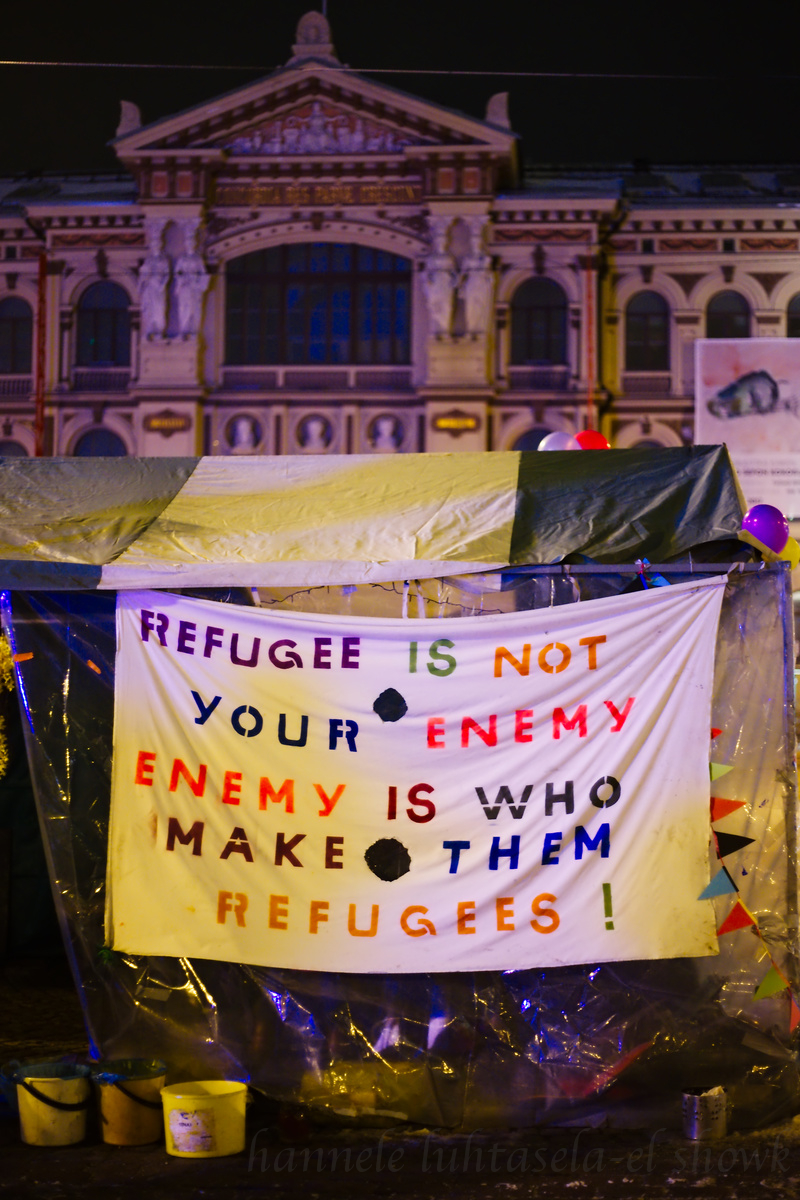 Efter det blev det lugnare. Barerna hade stängt och de sista nattbussarna hade åkt. Vi fick besök av några franska utbytesstuderanden som pratade med oss och dansade med asylsökarna. Min partner, som pratar arabiska, satt runt de glödande kolen och med unga män som berättade sina krigshistorier till varandra. Vem kunde gissa att dessa vackra unga människor som ler, sjunger och lär sej finska varit tillfångatagna av Daesh och torterats? De barnsliga idioter som går förbi och i sitt berusade tillstånd tycker att det är underhållande att ropa rasistiska slagord åt demonstranterna vet det säkert inte. De hjärtlösa människor som filmar en människa som försöker begå självmord och skrattar åt att hen inte lyckades kanske inte skulle bry sej fastän de visste. Jag hade gissat men att veta gör skillnad.