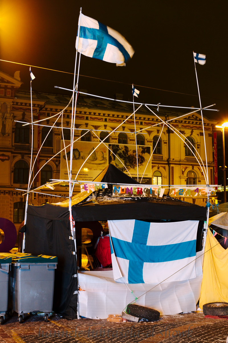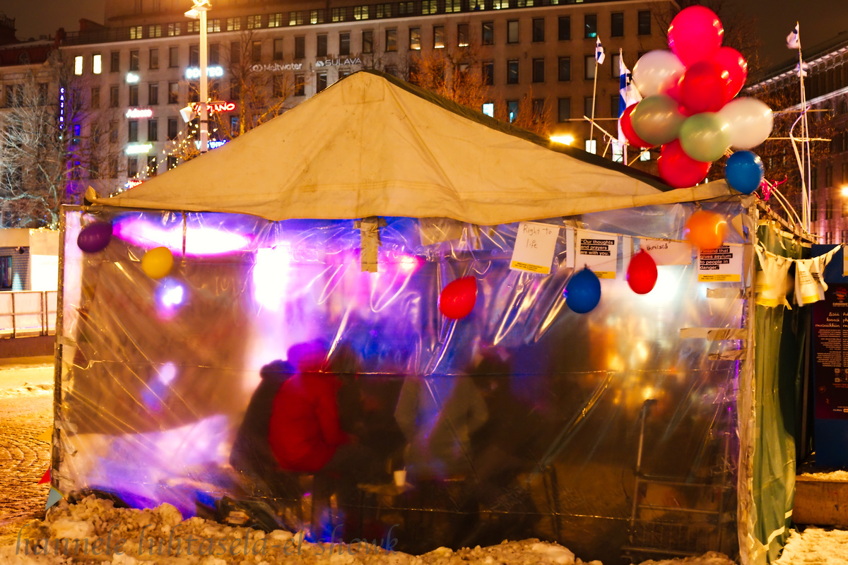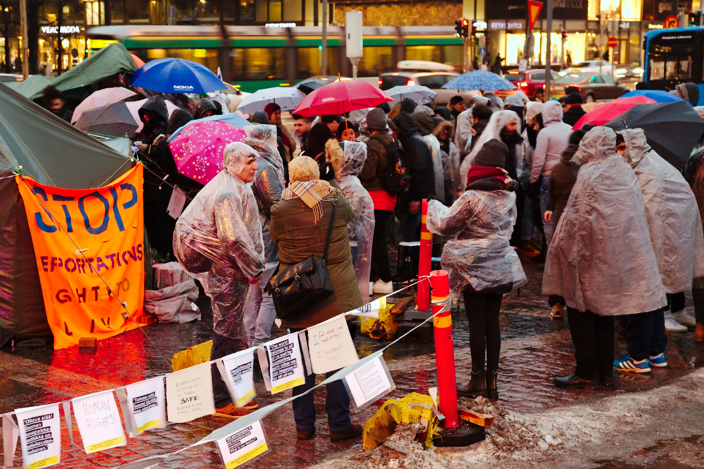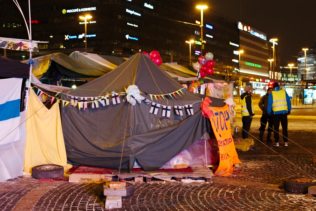 Demonstrationen mot en inhuman asylpolitik (Stop Deportations – Right to Live) har pågått i nästan en månad nu. Motdemonstrationen, Suomi Ensin (SE), har pågått lika länge. Först var demonstrationerna på varsin sida om Mannerheimvägen (asylsökandena utanför Kiasma och SE-gänget intill Glaspalatset) men förflyttades sedan till järnvägstorget, till varsin sida av isbanan.